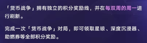 活动奖励:每次玩家完成货币战争对局即可去获取到星琼、深度沉浸器、助燃券等等的积分奖励内容。
