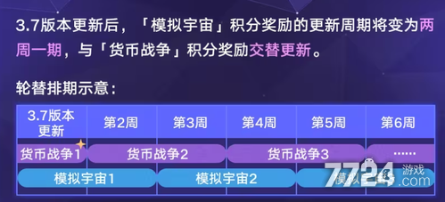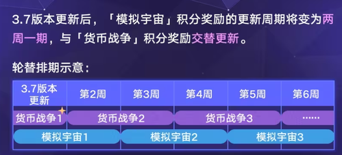 本次的3.7版本更新后货币战争会和模拟宇宙进行交替进行更新。此次的3.7版本第一周的货币战争玩法更新周期会去进行特殊的调整,官方也将会在后续去发布本次的第一期活动时间排期信息,大家可以关注官方去获取最新的版本信息,