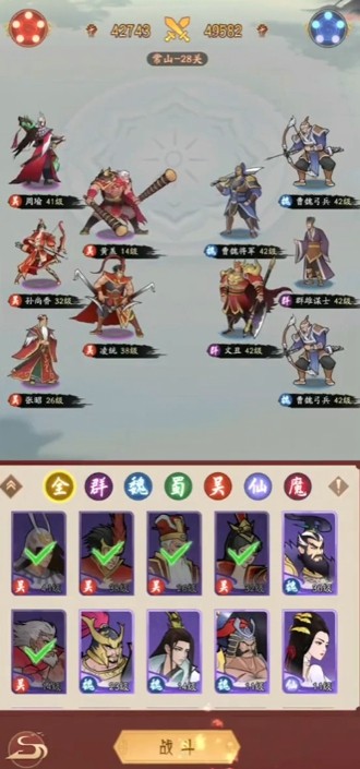 3.在实战中前期要优先清理掉小怪,保留大招到后期,中期优先集中控制击杀掉太史慈、甘宁两大核心输出,需要频繁利用治疗技能提升前排的血量,后期面对孙权的全屏伤害时可以开启免伤,即可顺利通关。