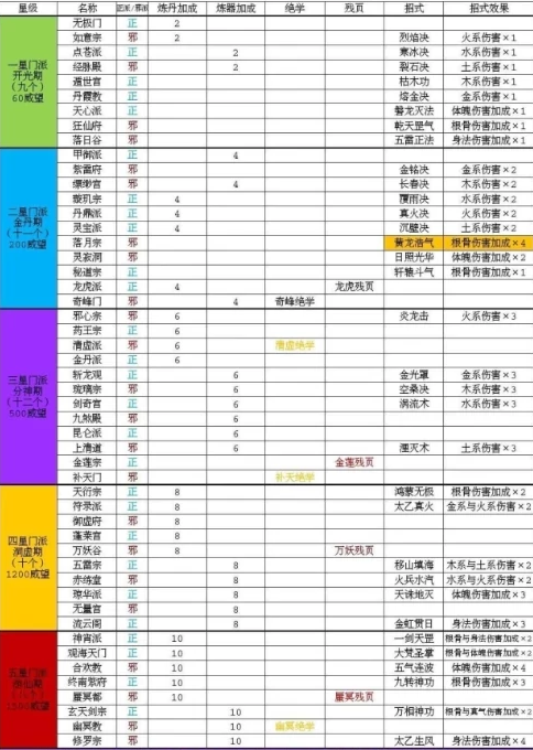 玩家们可以参考下方的这个表格汇总就能知道具体的功法的选择,选择最合适自己的功法进行学习,如果无法获取到六星以上的,可以优先的来选择五星门派基本就可以满足后期的境界了。