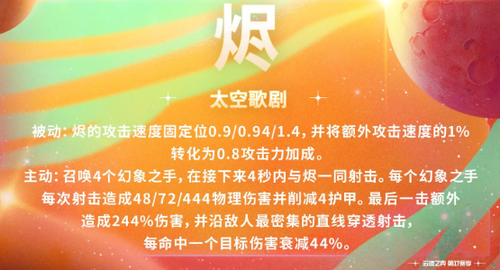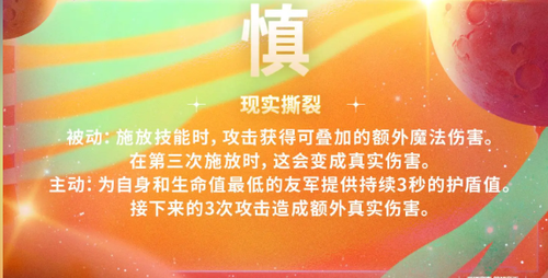 自身和友军提供护盾,普攻能不断的叠加额外伤害,每三次普通攻击将会转为真实伤害