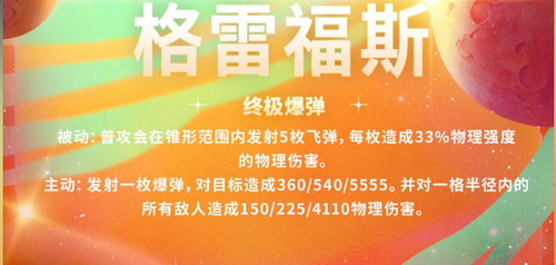 普攻锥形发射飞弹;主动技能可以发射爆弹造成范围物理伤害。