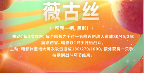 被动每 2 次攻击召唤暗影之手造成魔法伤害;主动技能可以增大暗影体型、增伤并额外获得一只手。