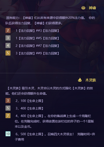 羁绊组成:木灵族(木灵弈子得到额外的生命加成,技能将会基于木灵数量升级)、神谕(增加蓝量自然回复效果,加快技能启动)。