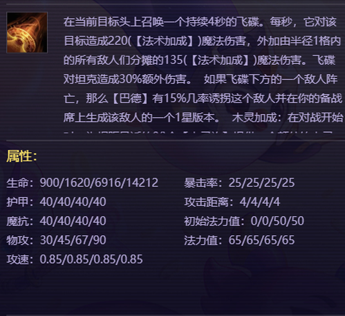 巴德释放一个飞碟,绑架场上随机目标,在对局中偶尔能偷到敌方关键棋子,偷到的棋子将会在我方备战席上生成一个一星单位,三星后将有几率将绑架的弈子直接升级为三星,可以为阵容提供额外的经济收入,遇到同行的可以直接帮我们偷到阵容的关键弈子,从而加速整体的阵容成型。