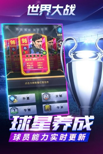 世界大战是一款充满创新的足球竞技类手游。玩家将扮演一名足球经理,在欧冠的背景下,组建并管理球队。游戏通过精致的3D画面和真实的物理引擎,还原了绿茵场的激情与荣耀。玩家需要招募和培养球星,精心布阵对战,制定战术安排,带领球队从底层联赛一路征战至欧冠之巅。