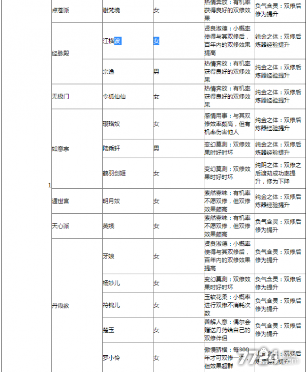 不管是用什么道侣那么这些道具的属性加成都是不同的,玩家一般在进行双修的效果以后,会有不同的效果,这里就需要看玩家们和什么道侣进行搭配,并且双修后也会有不同的效果,玩家们可以根据下方的这个表来了解下道侣属性,做个参考。