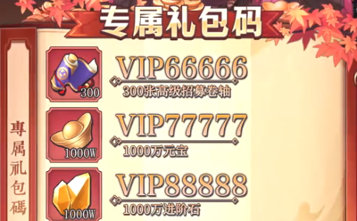 (1) VIP66666 兑换内容:元宝*88、普通招募卷轴*10、少量武将经验