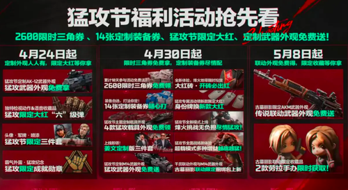 三角洲行动的猛攻节活动将会从4月24日开启,大家期待的装备券赠送则是会在4月29日更新后开始赠送。活动期间玩家每日登陆即可领取2 张精锐制式装备券 +